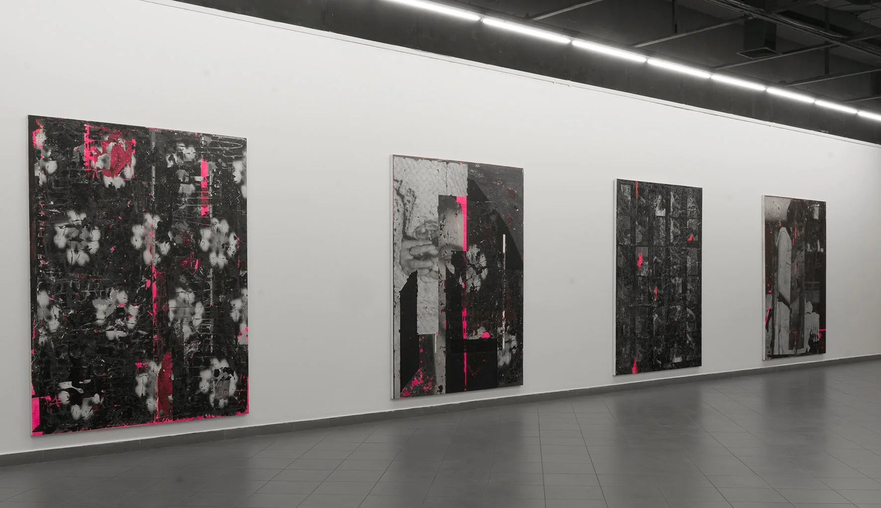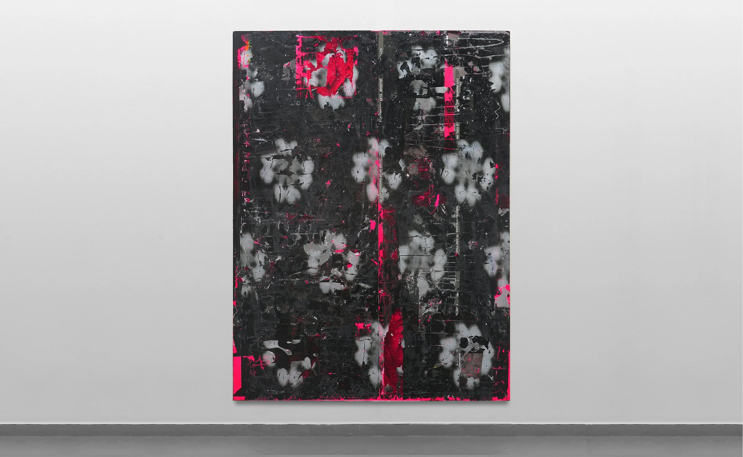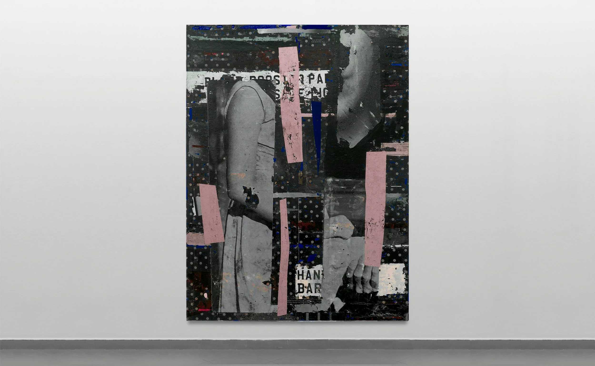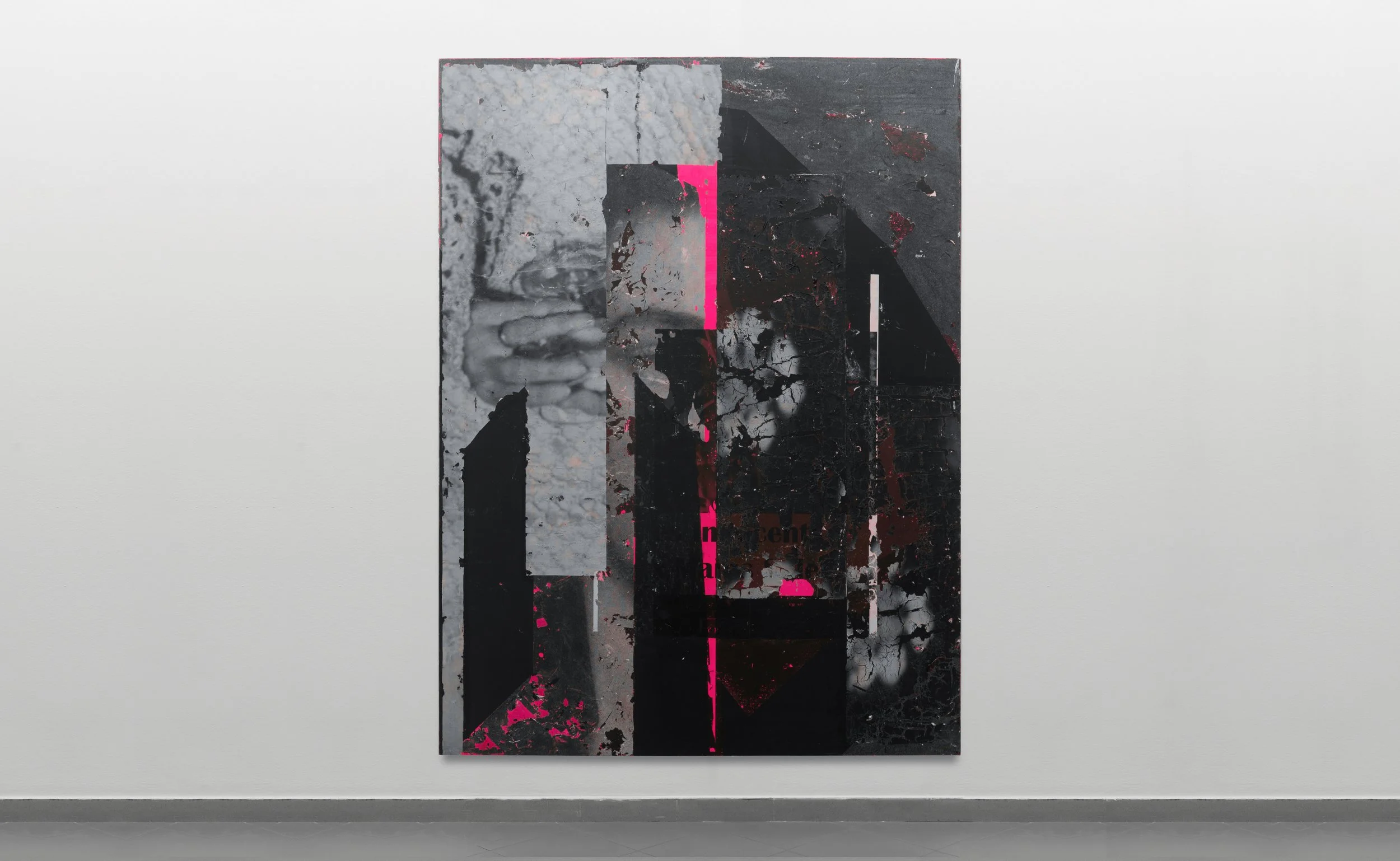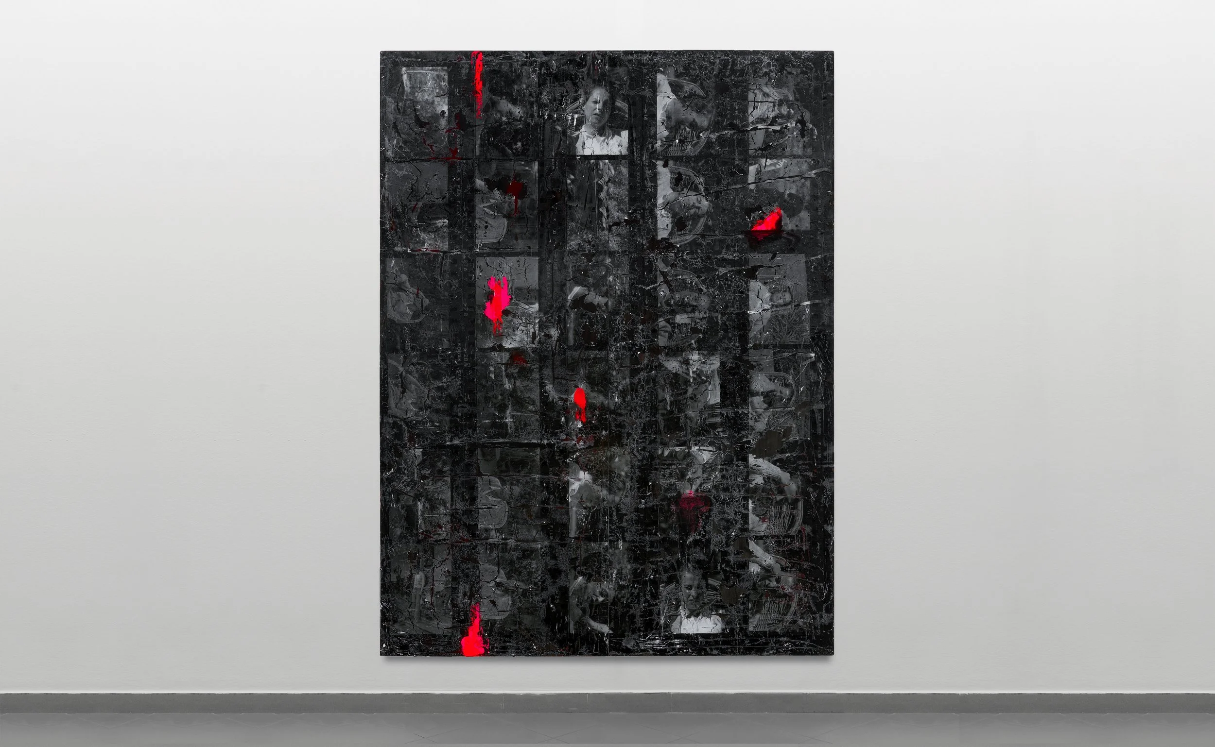 Edited fragments of words, printed photographs, or frames act as unexpected and disjointed returns of a black-and-white visual memory, forming the grand plane of the canvas through montage, almost sculpted by the accumulation of successive layers of adhesion. A rough, discontinuous adhesion, not foreign to multiple tears and regrets, constitutes the main resource of this mediated painting, ultra-technified and, in a certain sense, also automatic.